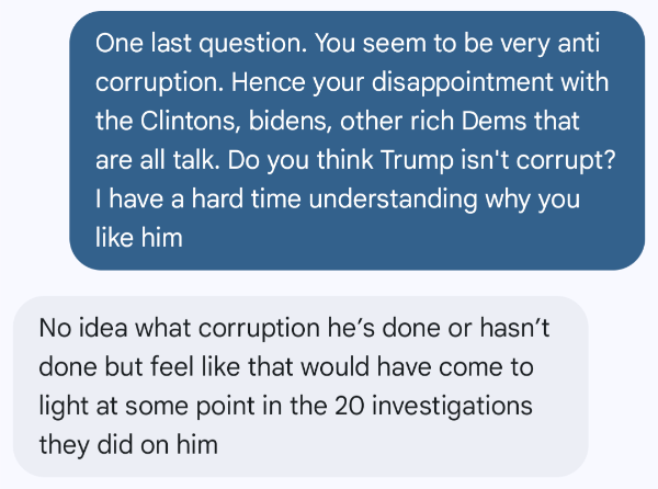 I responded, “it did come to light!” and provided the basic examples you might think of, citing his conviction and off the charts conflicts of interest. They were all met with “no, the attorney general was corrupt, not Trump.” He provided some more dead-end rebuttals to the multiple examples of Trump corruption I provided, and then the conversation was over. Of course the conversation ends, because when all you know are thought-limiting cognitive biases, your little world gets so small that conversations can’t go on that long.